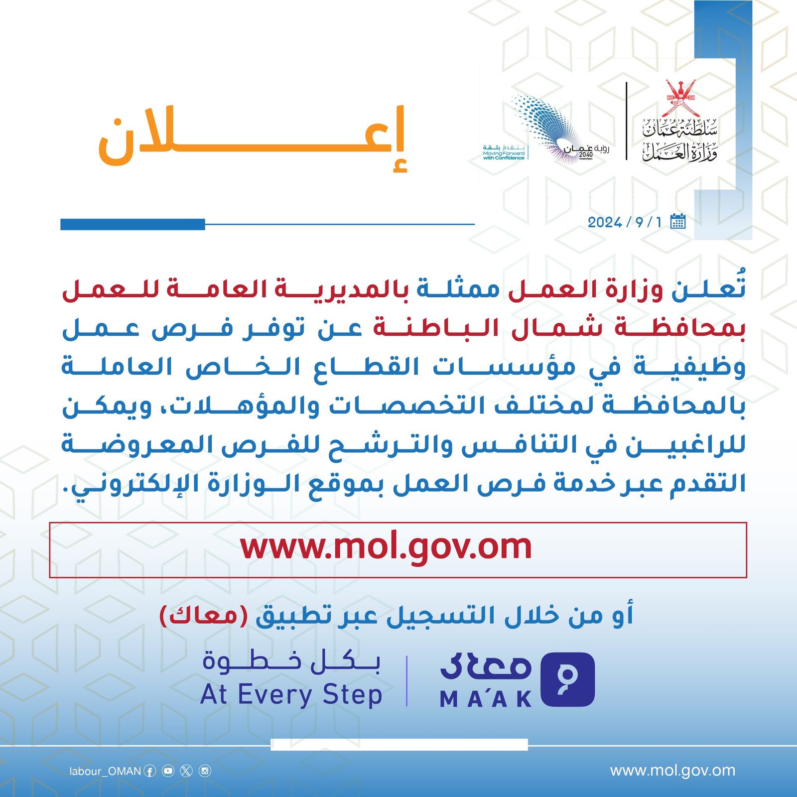 وزارة العمل ممثلة بالمديرية العامة للعمل في محافظة شمال الباطنة - توفر فرص عمل وظيفية في مؤسسات القطاع الخاص
