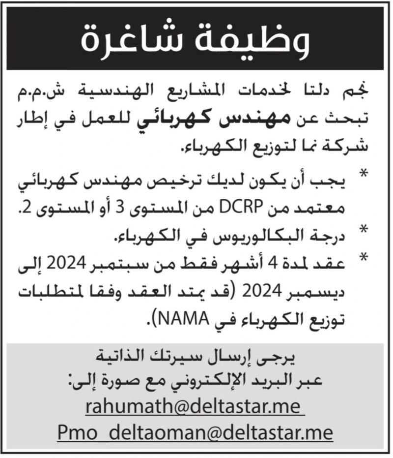 شركة دلتا لخدمات المشاريع الهندسية - وظيفة شاغرة ( مهندس كهربائي )
