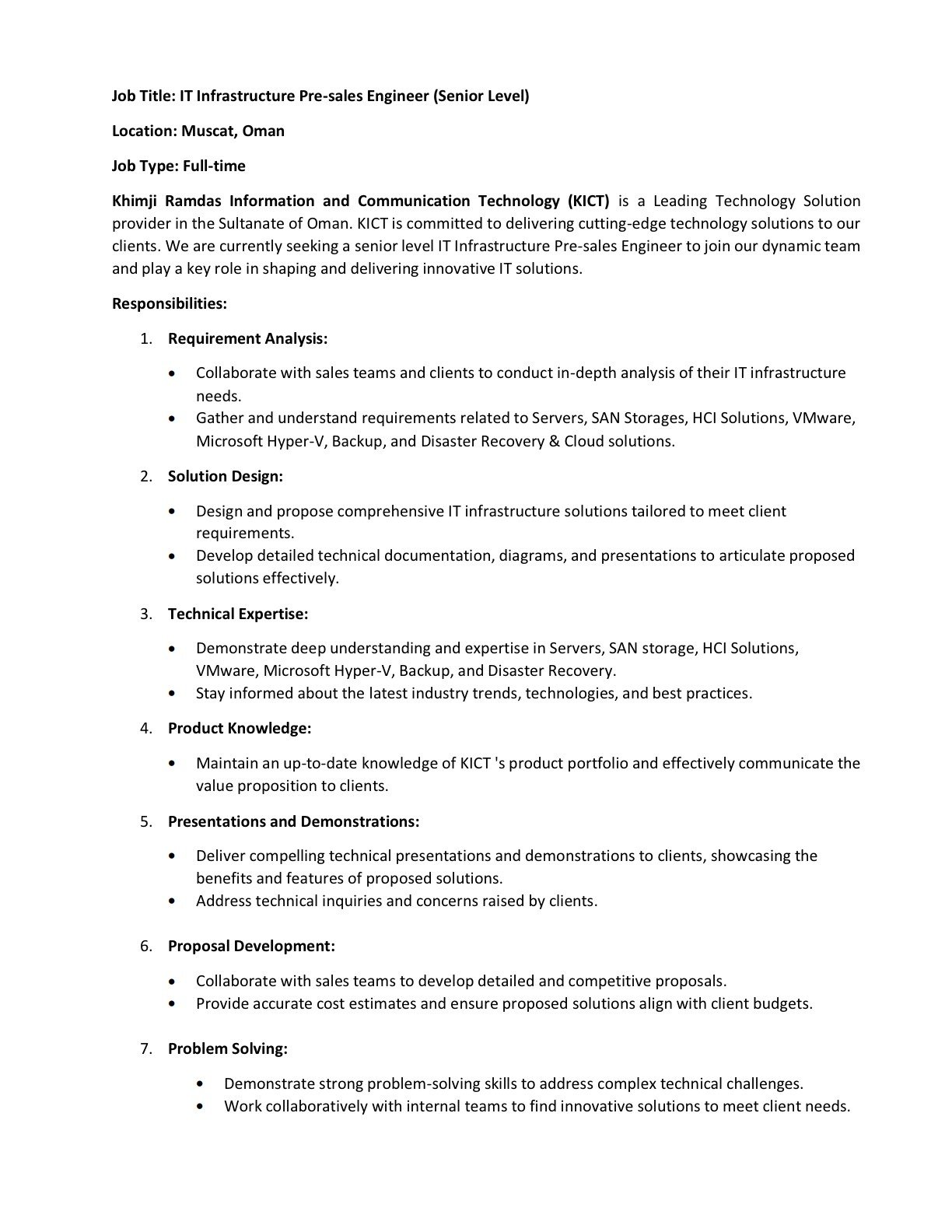 شركة كيمجي رامداس لتقنية المعلومات والاتصالات - وظيفة شاغرة ( IT Infrastructure Pre-sales Engineer )