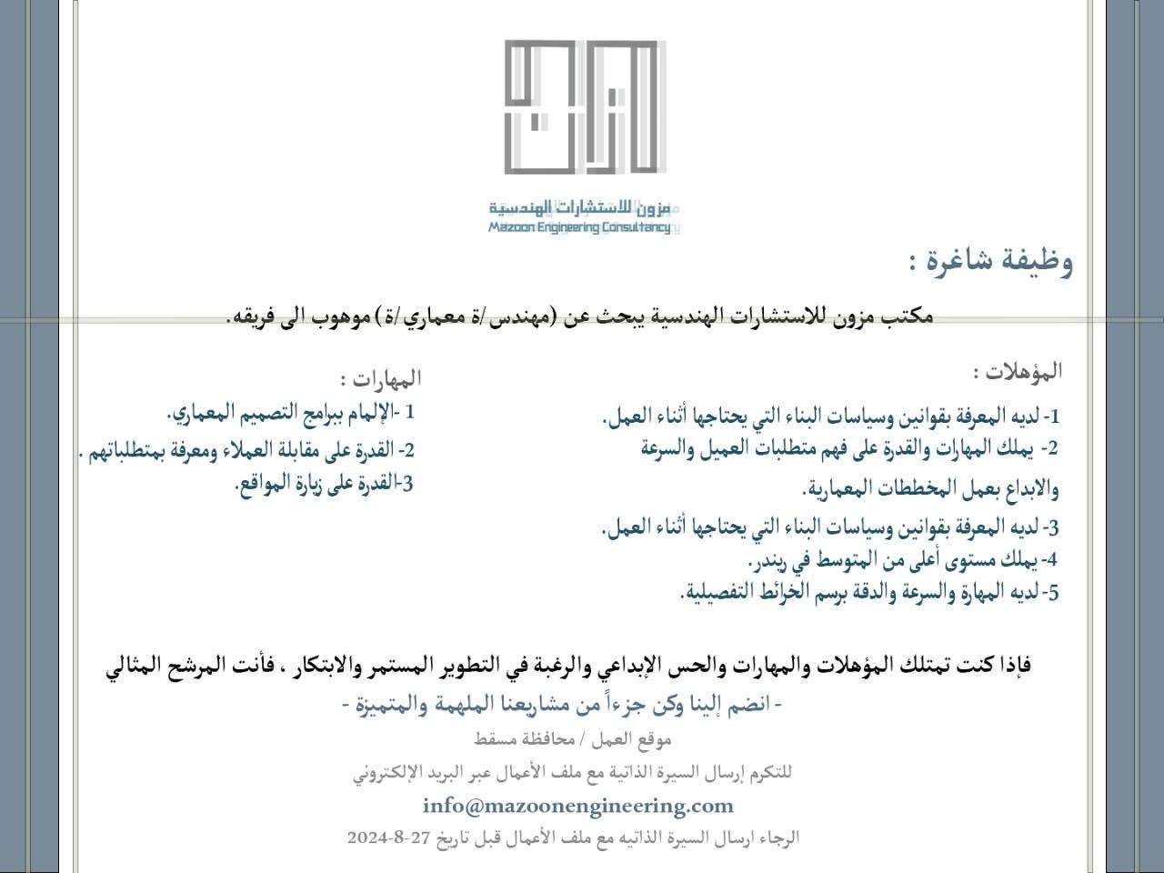 مرون للاستشارات الهندسية - وظيفة شاغرة ( مهندس/ة معماري/ة )