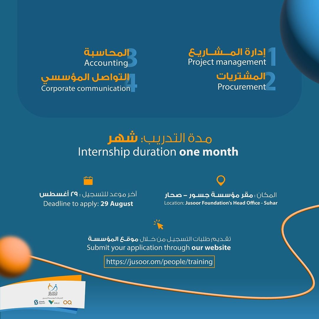 مؤسسة جسور - فرص تدريب لمدة شهر في مجالات ( إدارة المشاريع + المحاسبة + المشتريات + التواصل المؤسسي )