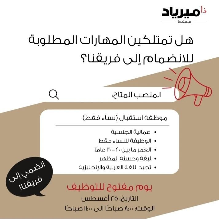 ميرياد مسقط - وظيفة شاغرة ( موظفة استقبال )