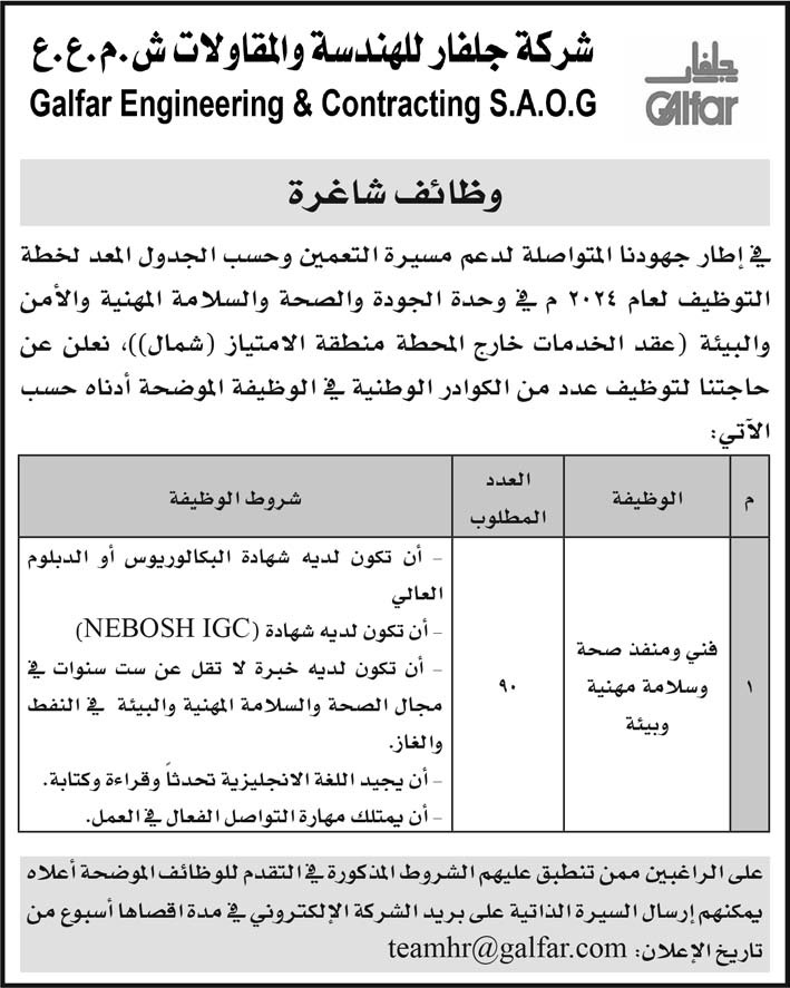 شركة جلفار للهندسة والمقاولات - وظيفة شاغرة ( فني ومنفذ صحة وسلامة مهنية وبيئة )