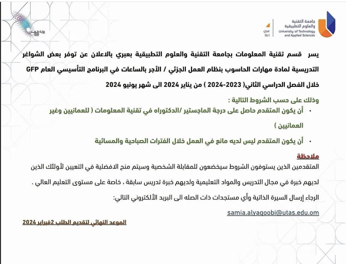 جامعة التقنية والعلوم التطبيقية بعبري - فرص شواغر تدريسية بنظام العمل الجزئي / الأجر بالساعات