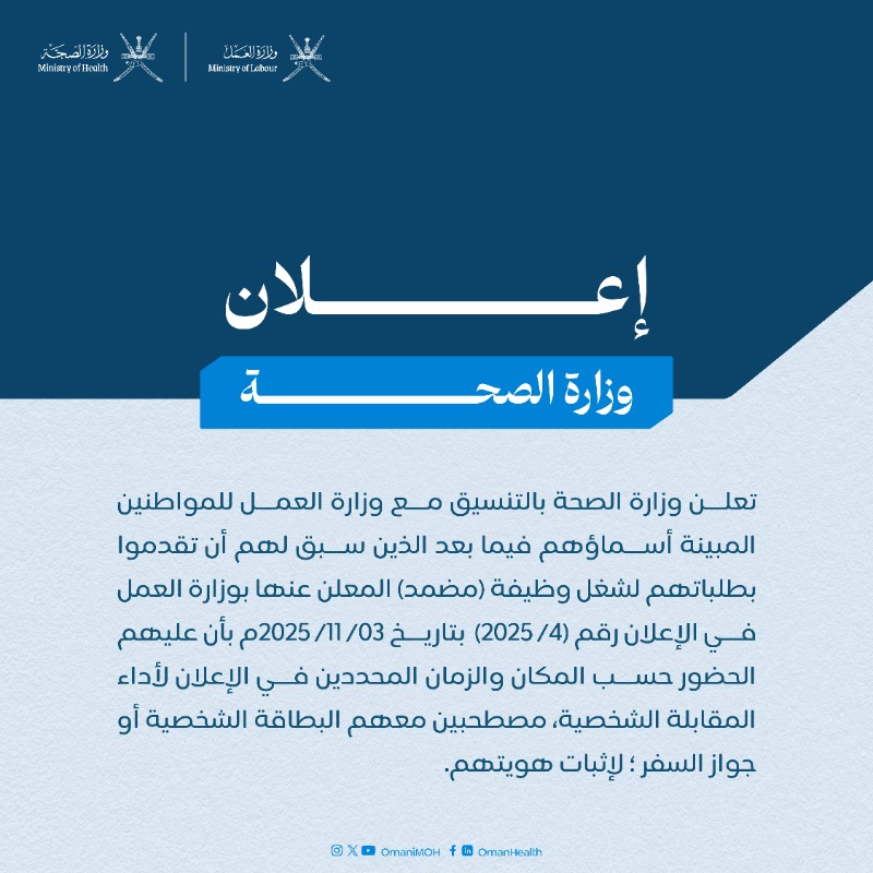 وزارة الصحة - أسماء مواطنين لأداء المقابلة الشخصية لشغل وظيفة ( مضمد ) محافظة مسندم