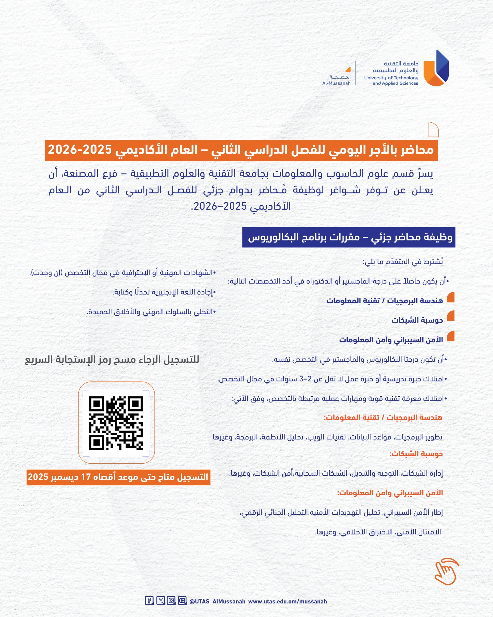 جامعة التقنية والعلوم التطبيقية فرع المصنعة - توفر شواغر لوظيفة مُحاضر بدوام جزئي