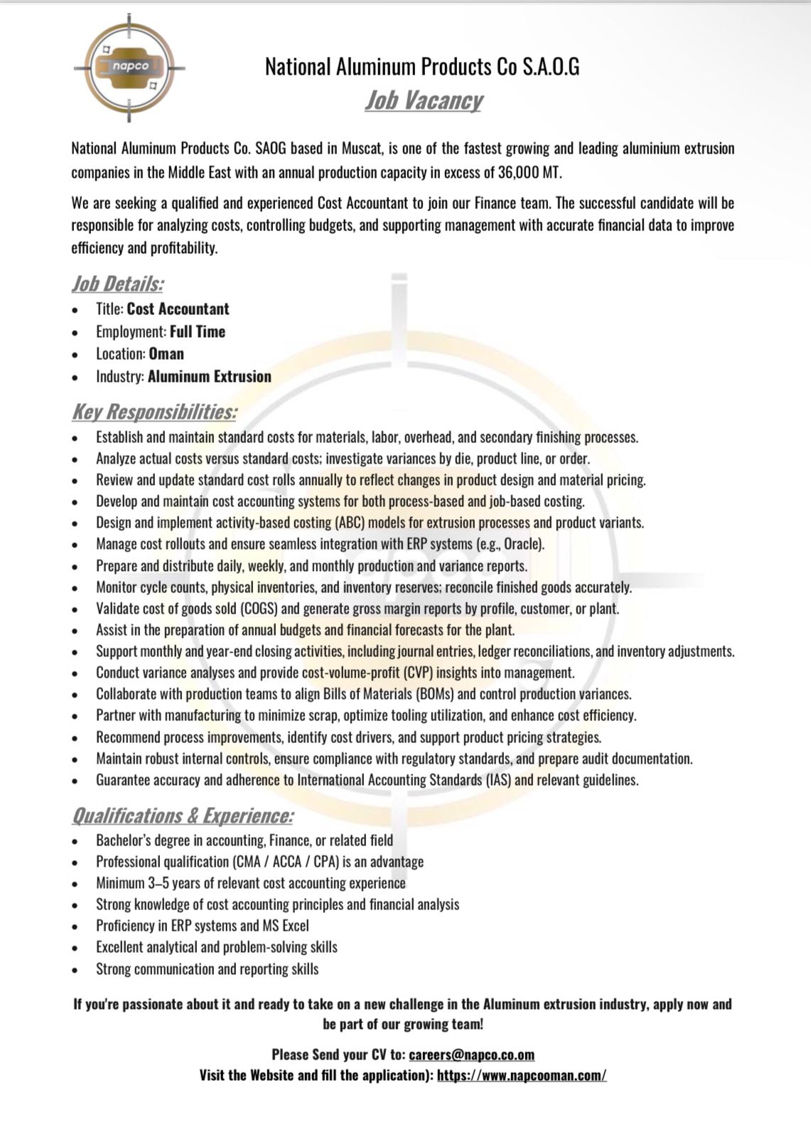 الشركة الوطنية لمنتجات الألمنيوم - وظيفة شاغرة ( Cost Accountant )