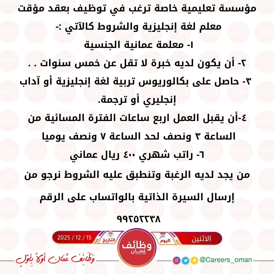 مؤسسة تعليمية خاصة - وظيفة شاغرة بعقد مؤقت ( معلم لغة إنجليزية )