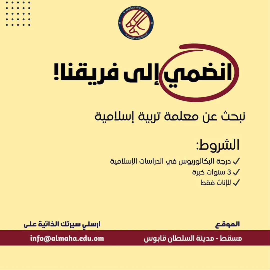 مدرسة المها الخاصة في مسقط - وظيفة شاغرة ( معلمة تربية إسلامية )
