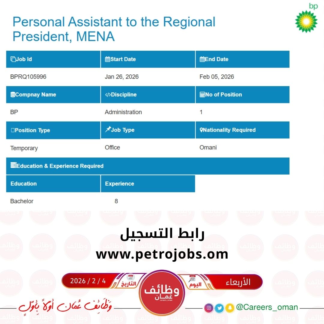 شركة بي بي عمان - وظيفة شاغرة ( Personal Assistant to the Regional President, MENA )