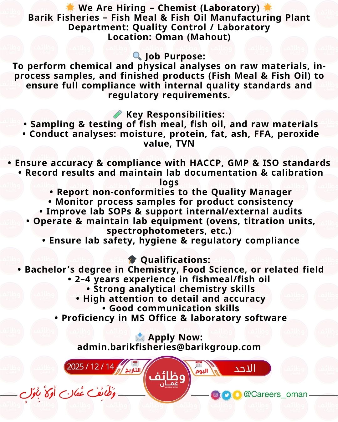 شركة Barik Fisheries - وظيفة شاغرة ( Chemist - Laboratory )