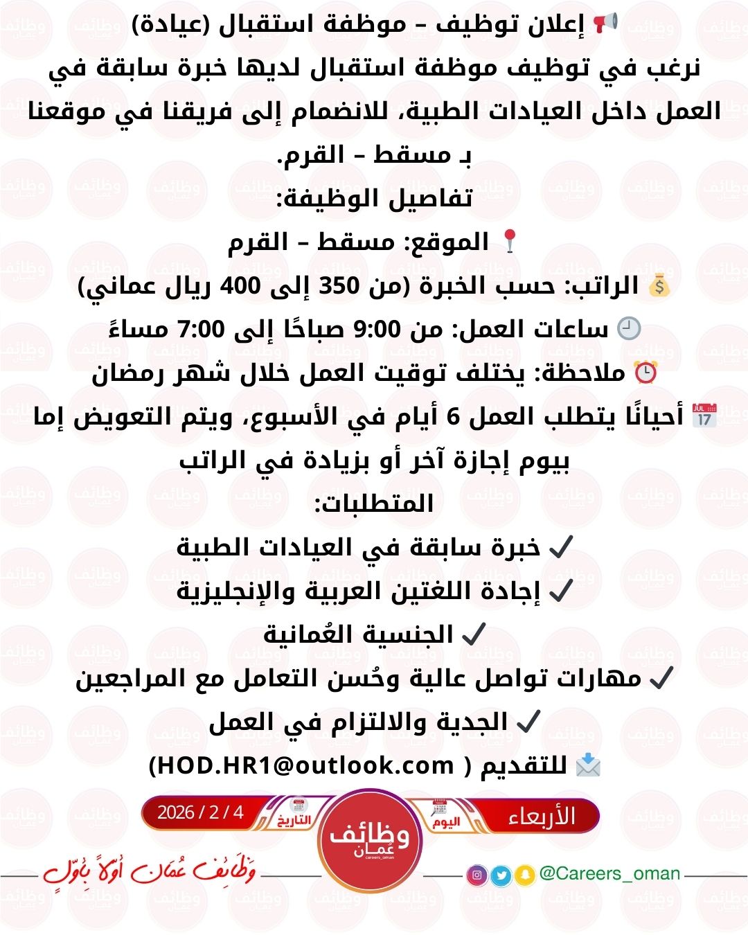 عيادة تجميل في مسقط - وظيفة شاغرة ( موظفة استقبال )
