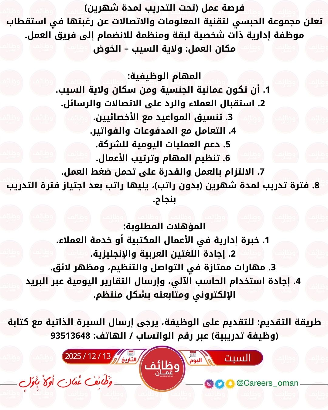 مجموعة الحبسي لتقنية المعلومات والاتصالات في الخوض - فرصة عمل تحت التدريب لمدة شهرين ( موظفة إدارية )