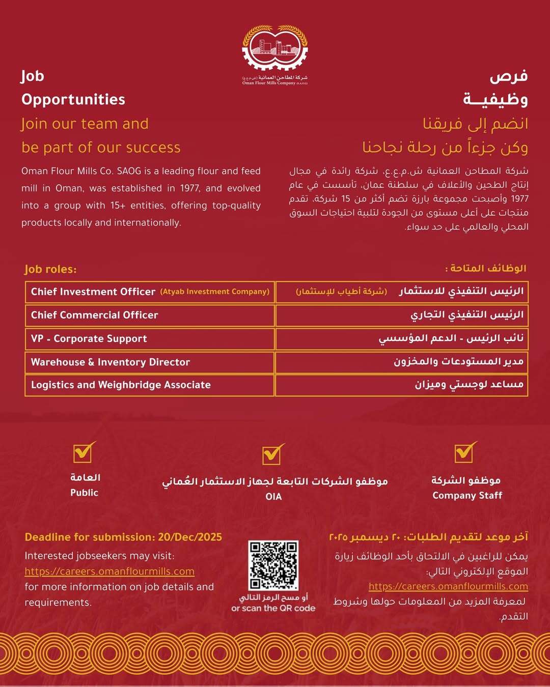 شركة المطاحن العُمانية - 5 وظائف شاغرة