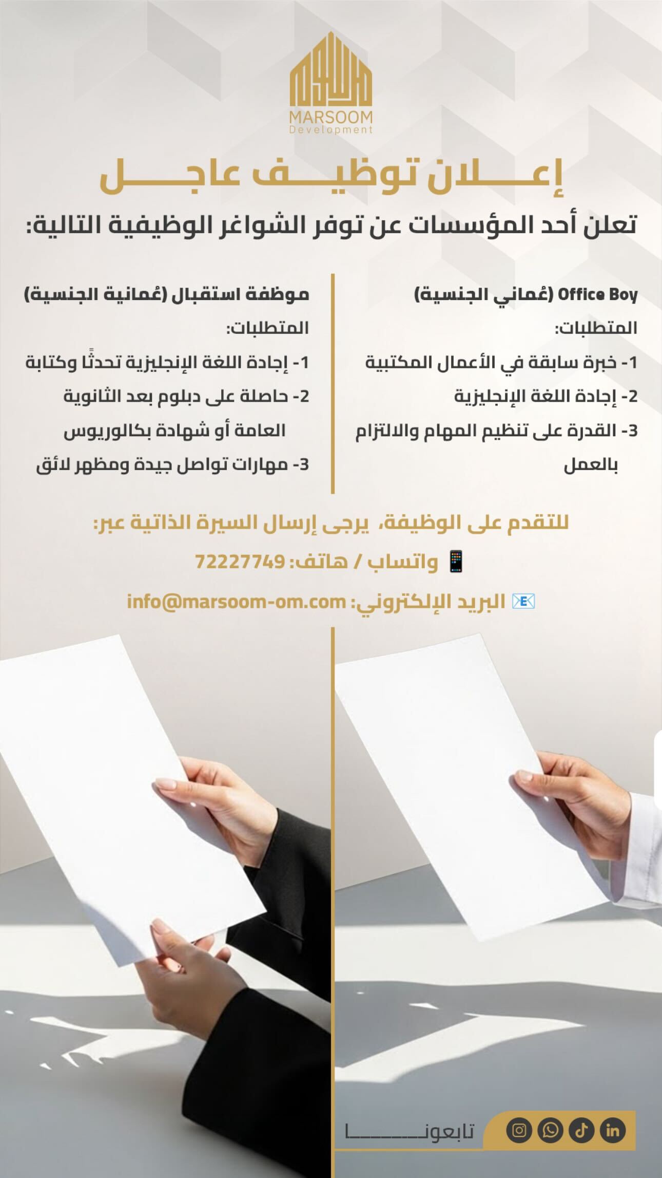 شركة مرسوم للتطوير العقاري في مسقط - فرص وظيفية ( موظف استقبال + Office Boy )