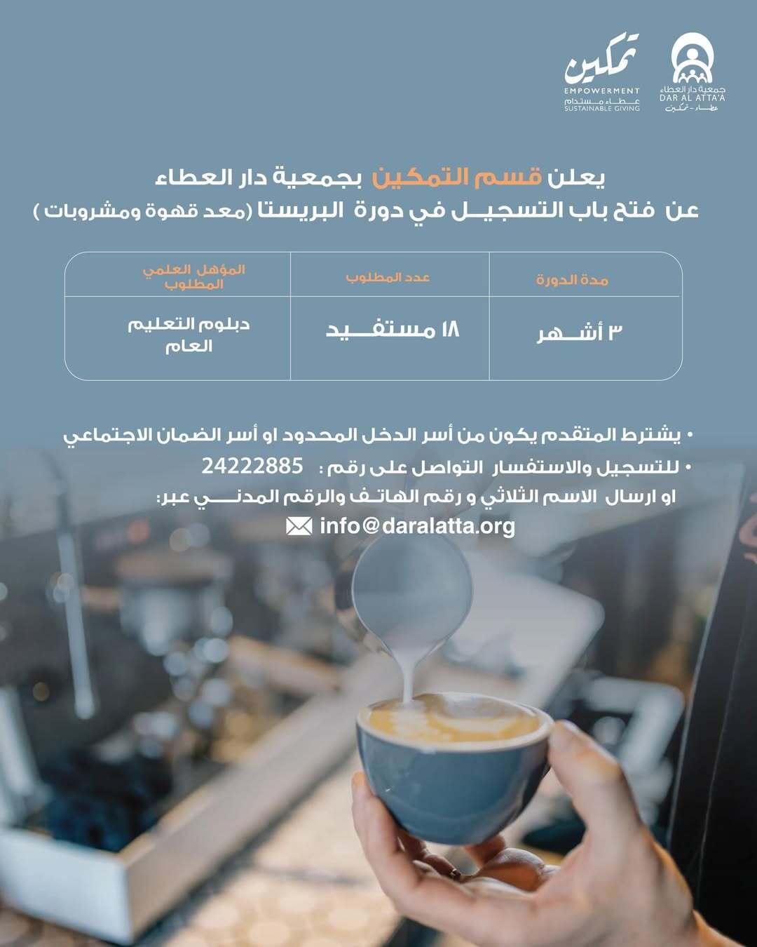 جمعية دار العطاء – دورة تدريبية في إعداد القهوة والمشروبات (باريستا) لمدة 3 أشهر