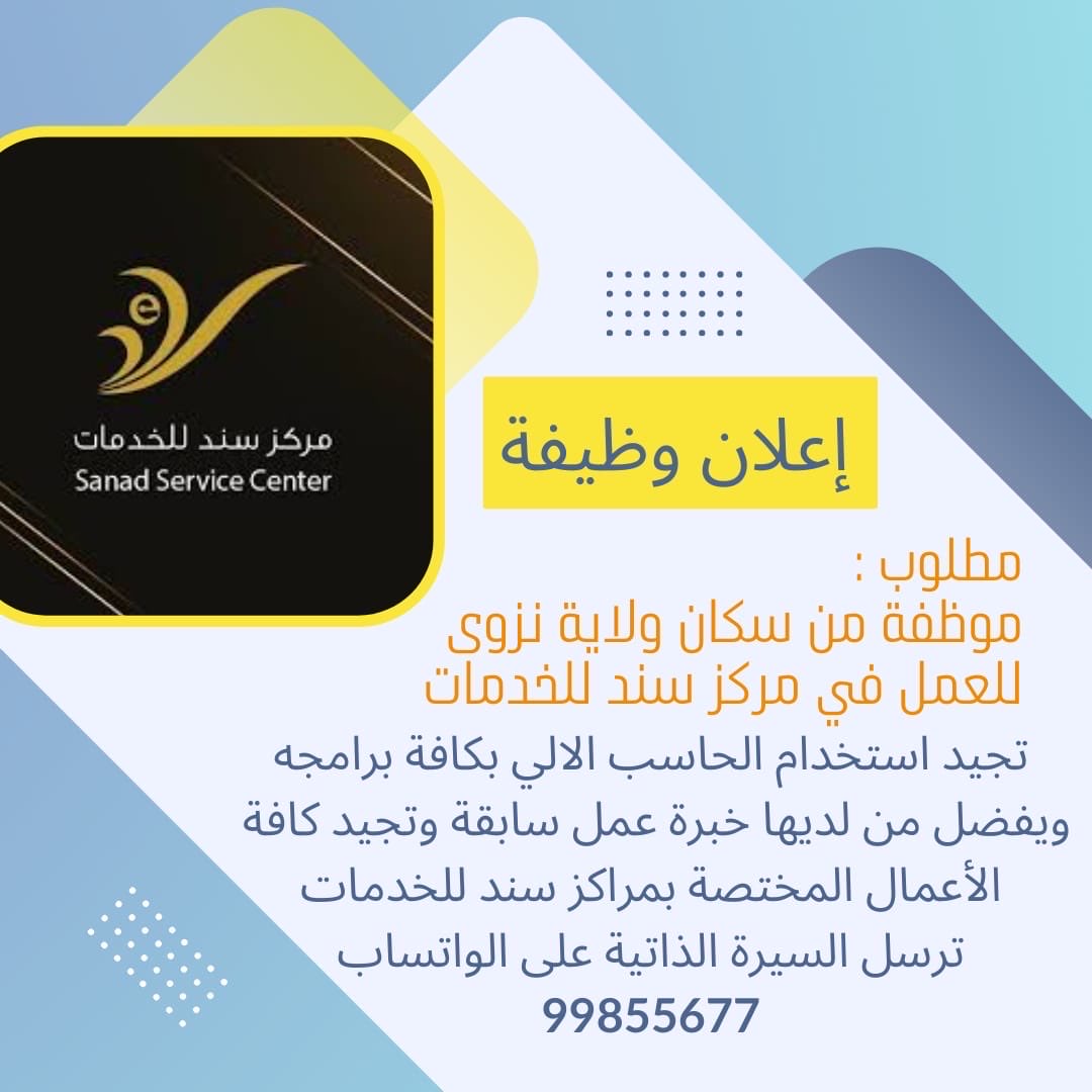 مركز سند للخدمات في ولاية نزوى - وظيفة شاغرة ( موظفة )