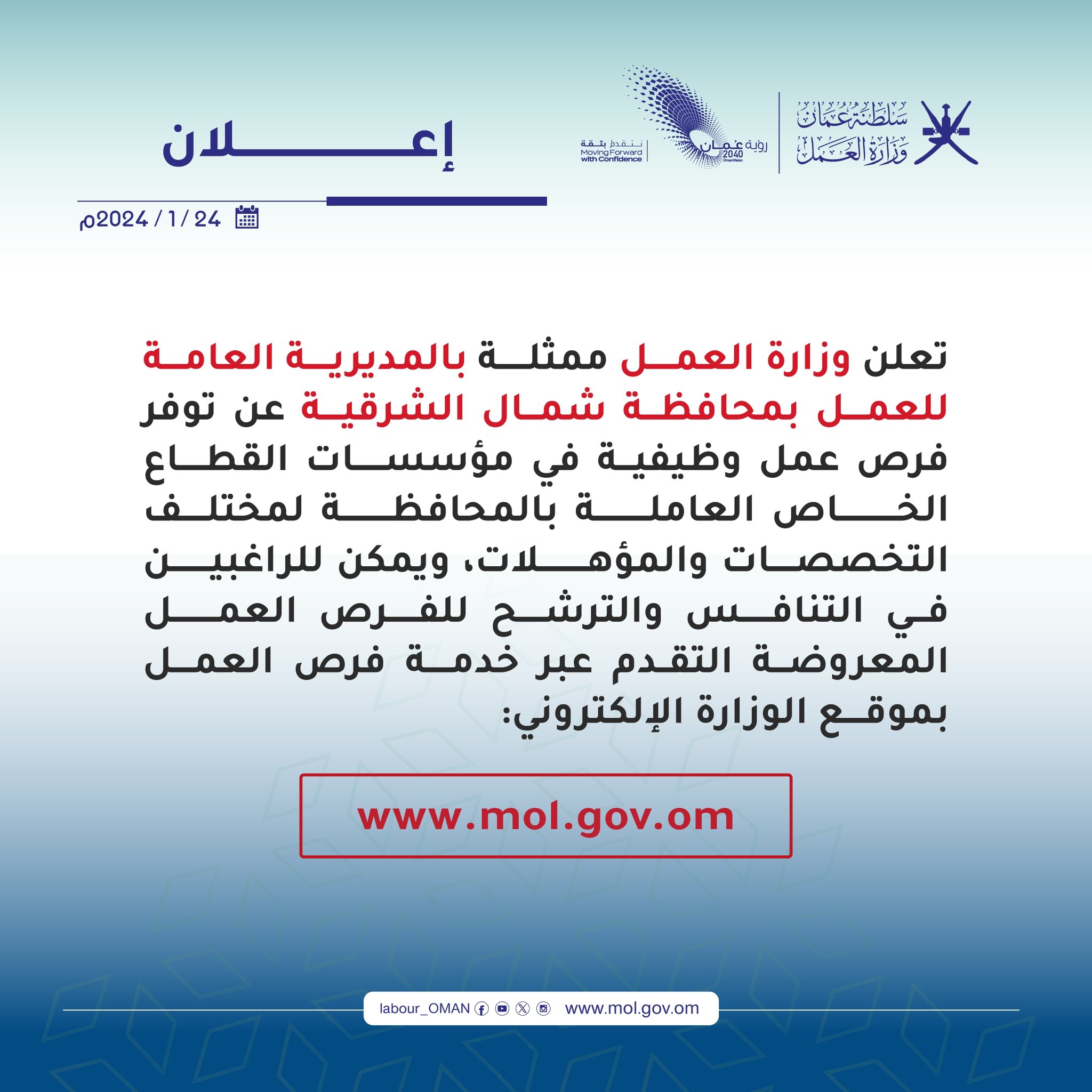 وزارة العمل ممثلة بالمديرية العامة للعمل بمحافظة شمال الشرقية - توفر فرص عمل وظيفية في مؤسسات القطاع الخاص