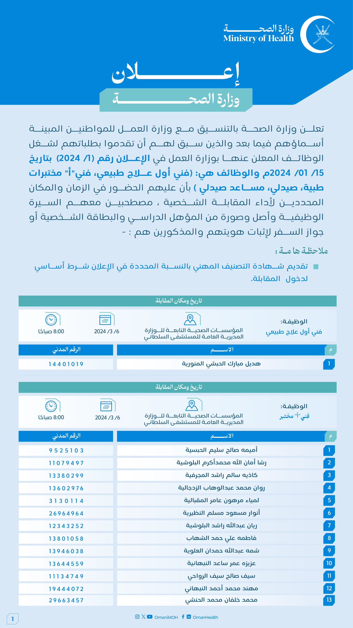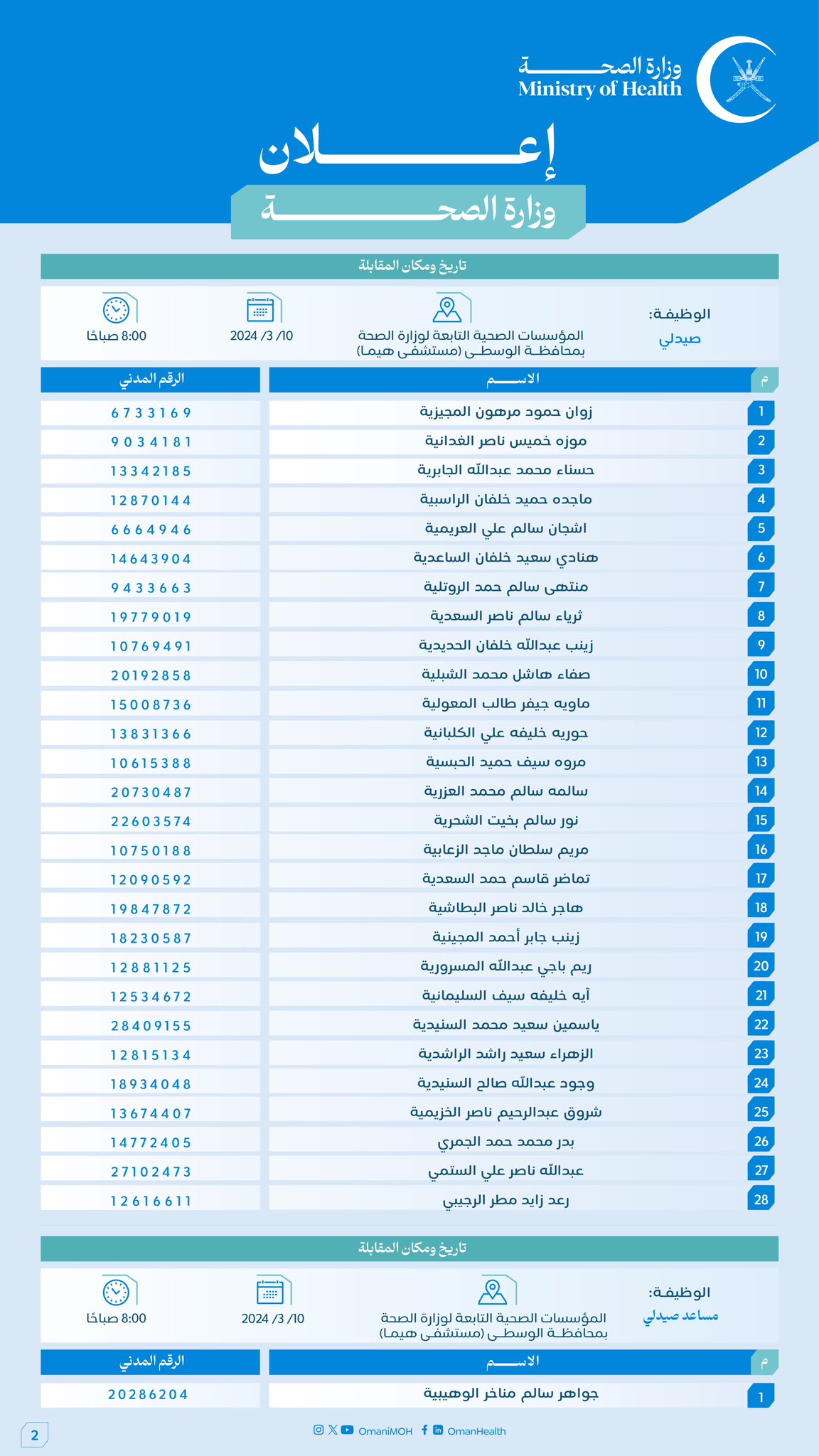 وزارة الصحة - أسماء مواطنين لإجراء المقابلة الشخصية لشغل وظائف (فني أول علاج طبيعي، فني "أ" مختبرات طبية، صيدلي، مساعد صيدلي)