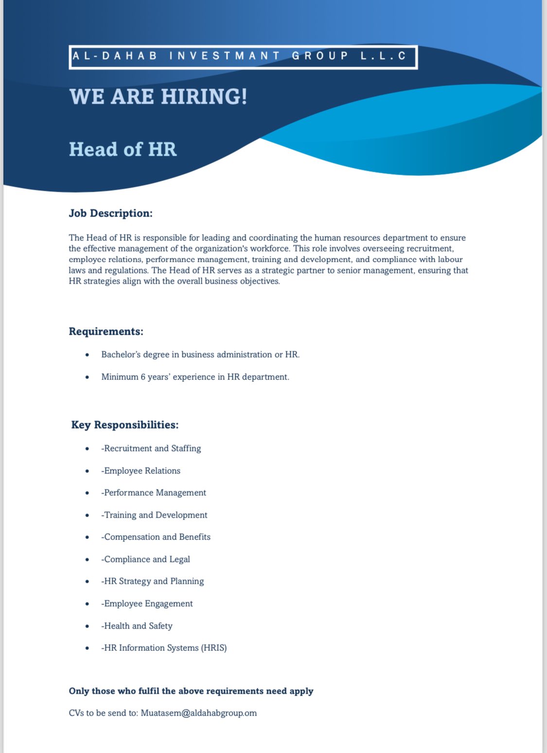 ارسل السيرة الذاتية على الايميل Muatasem@aldahabgroup.om