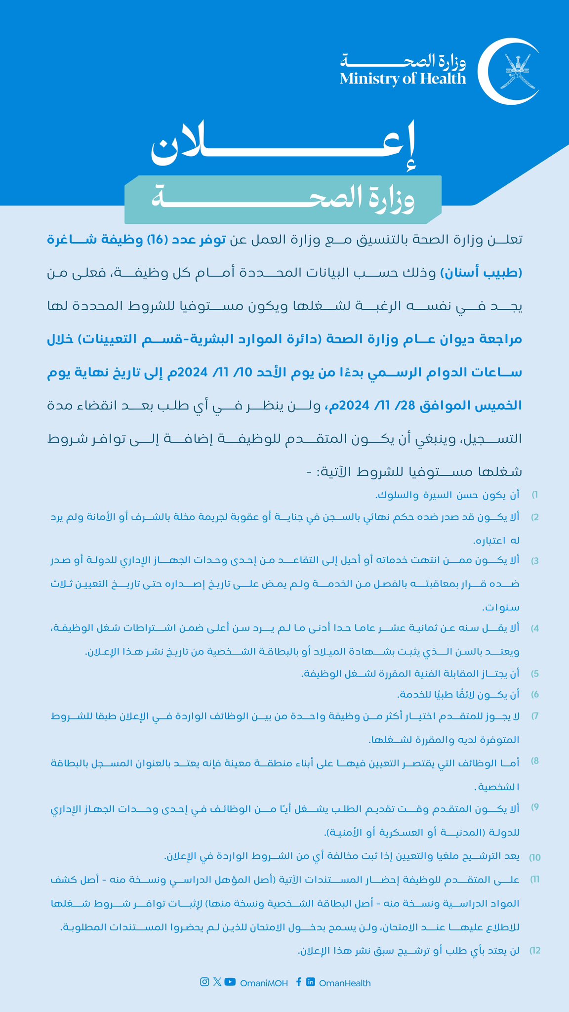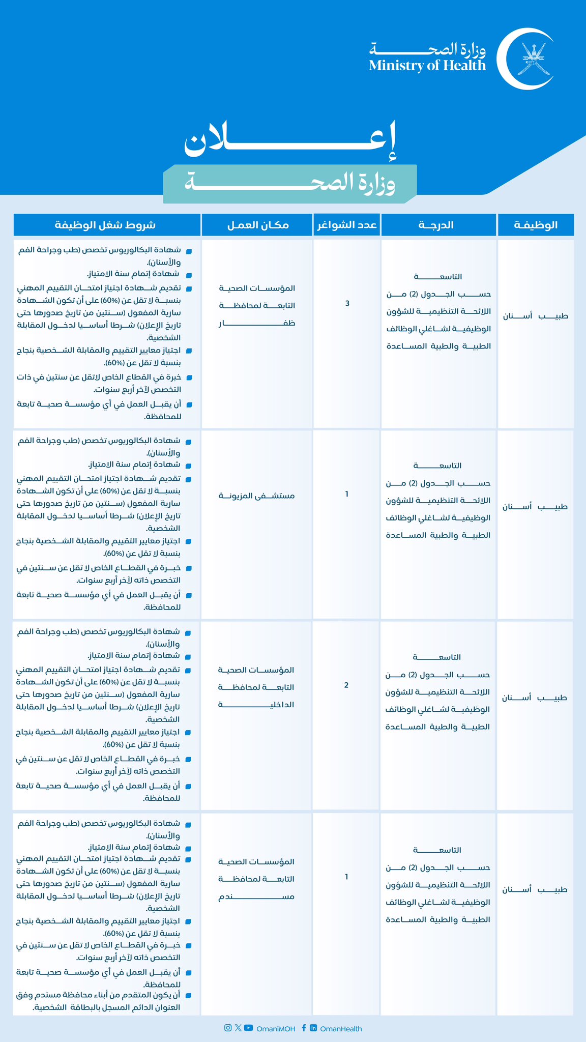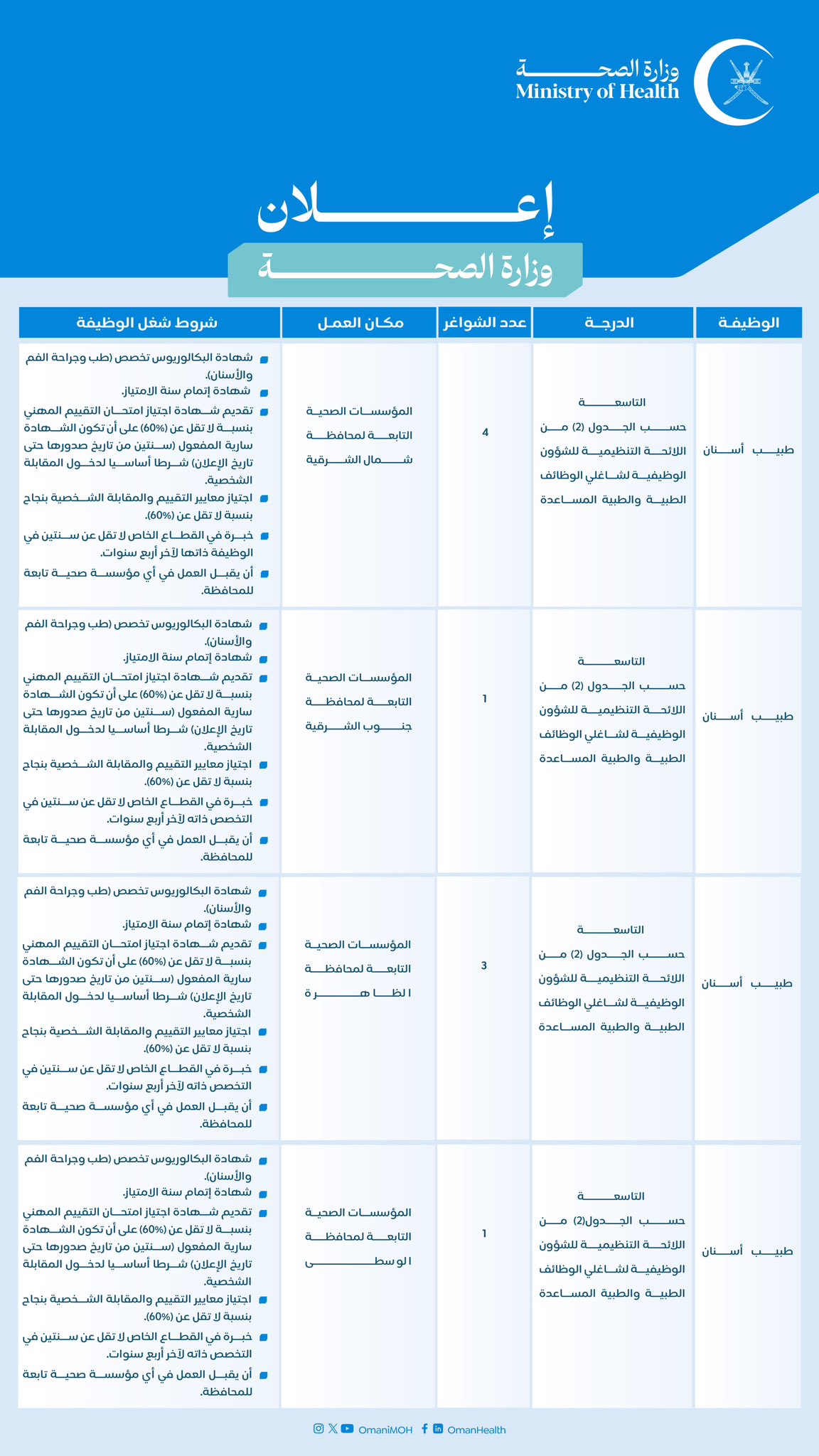 وزارة الصحة - توفر عدد (16) وظيفة شاغرة (طبيب أسنان)