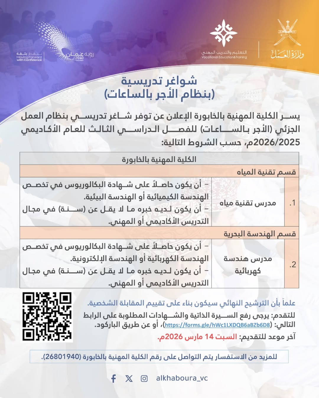 الكلية المهنية بالخابورة - توفر شاغر تدريسي بنظام العمل الجزئي (الأجر بالساعات)