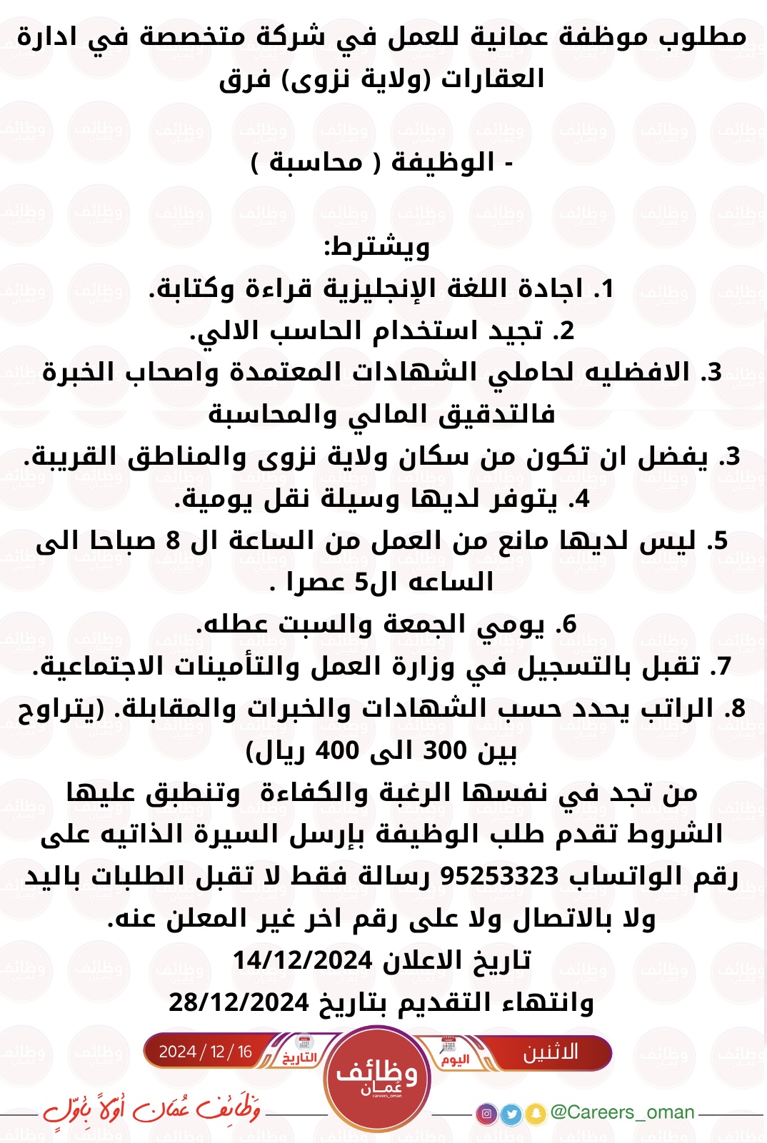 شركة متخصصة في ادارة العقارات بولاية نزوى - وظيفة شاغرة ( محاسبة )