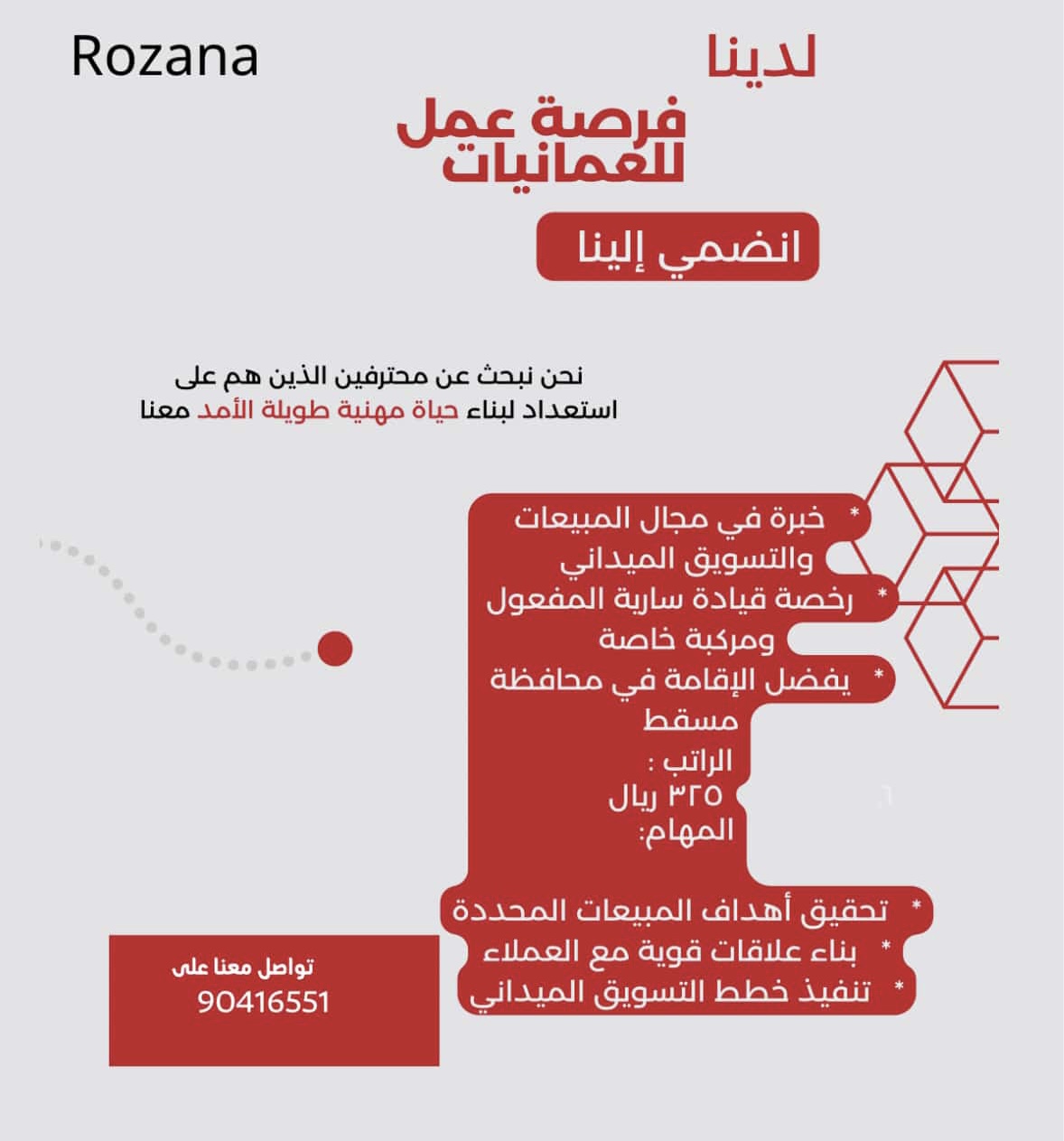 شركة روزانا في مسقط - وظيفة شاغرة ( المبيعات والتسويق الميداني )