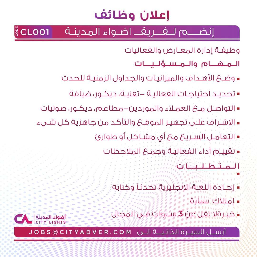 شركة اضواء المدينة - فرص وظيفية ( أخصائي تسويق ميداني خارجي + إدارة المعارض والفعاليات )