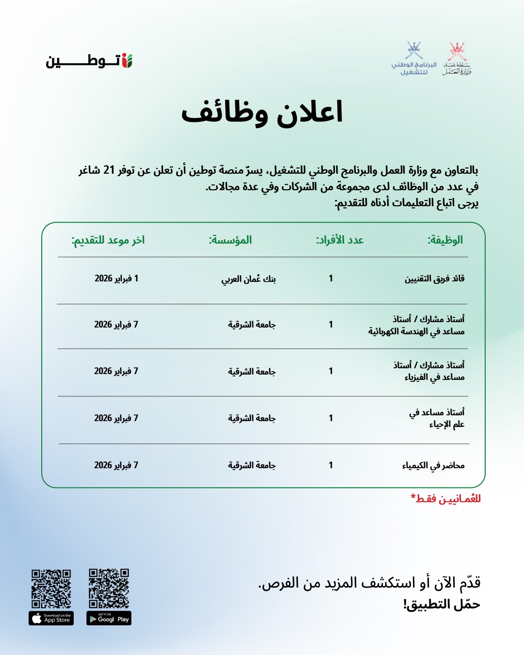 منصة توطين - توفر 21 شاغر وظيفية لدى مجموعة من الشركات وفي عدة مجالات