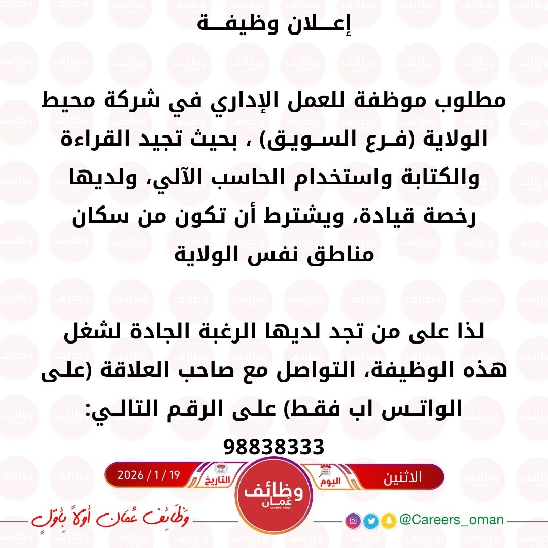 شركة محيط الولاية فرع السويق - وظيفة شاغرة ( موظفة للعمل الإداري )