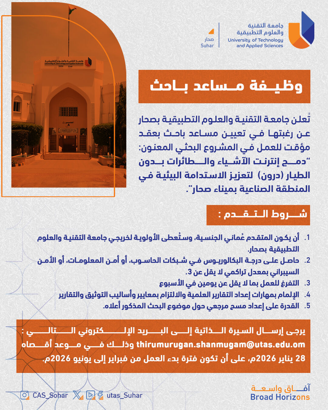 جامعة التقنية والعلوم التطبيقية بصحار - وظيفة شاغرة ( مساعد باحث بعقد مؤقت )