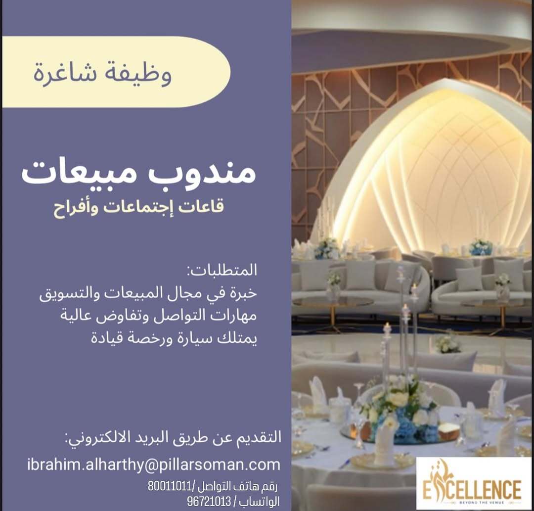 قاعة أفراح واجتماعات - وظيفة شاغرة ( مندوب مبيعات )