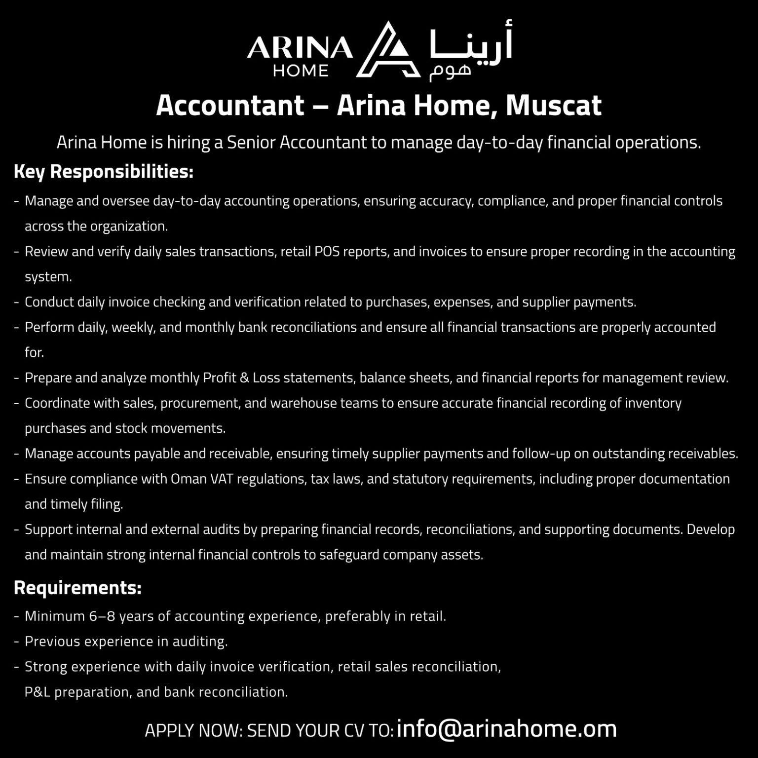 شركة أرينا هوم في مسقط - وظيفة شاغرة ( محاسب )