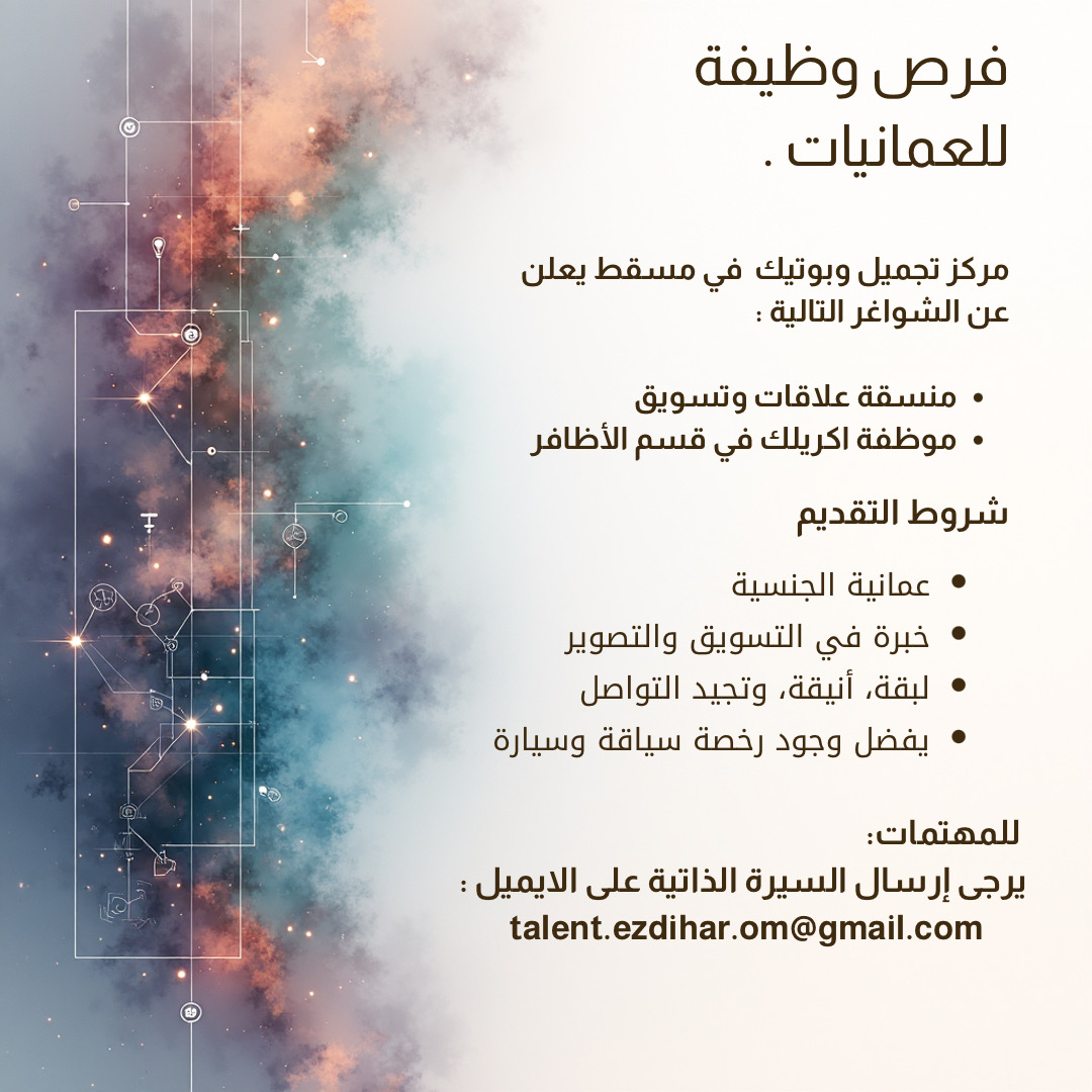 مركز تجميل وبوتيك في مسقط - فرص وظيفية ( منسقة علاقات وتسويق + موظفة اكريلك في قسم الأظافر )