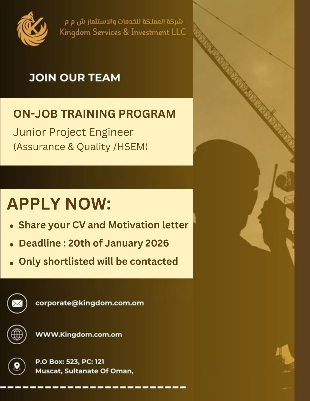 شركة المملكة للخدمات والاستثمار في مسقط - فرصة تدريب Junior (Project Assurance & Quality Engineer/HSEM Engineer) )