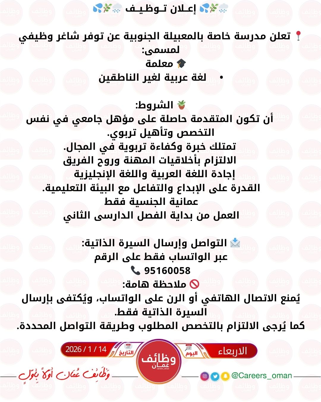 مدرسة خاصة بالمعبيلة الجنوبية - وظيفة شاغرة ( معلمة لغة عربية لغير الناطقين )