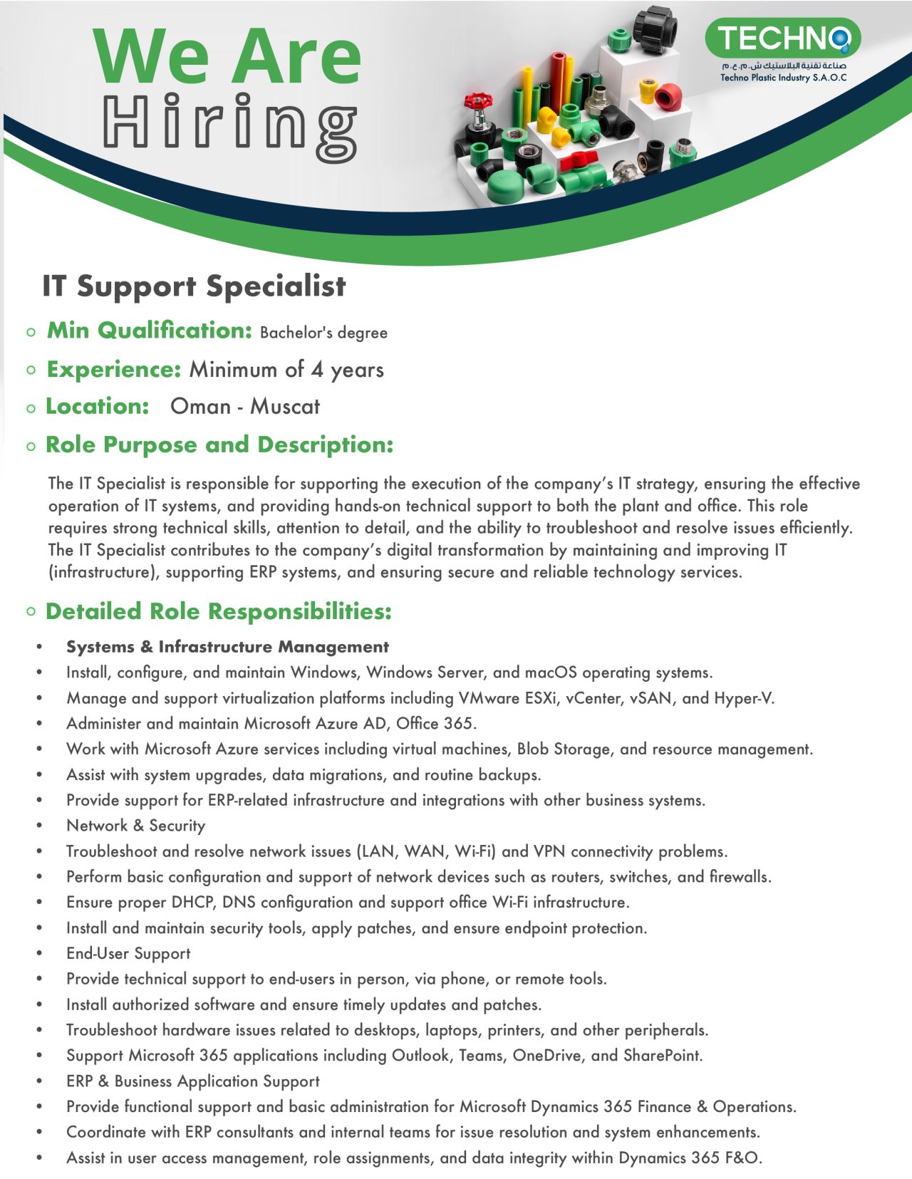 شركة صناعة تقنية البلاستيك في مسقط - وظيفة شاغرة ( IT Support Specialist )