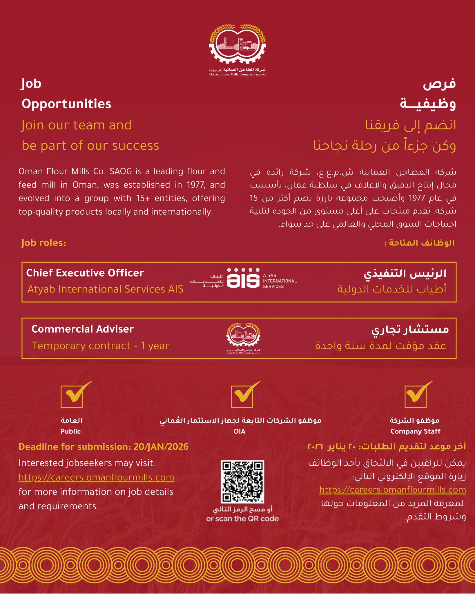 شركة المطاحن العُمانية - توفر فرص وظيفية ( الرئيس التنفيذي + مستشار تجاري )