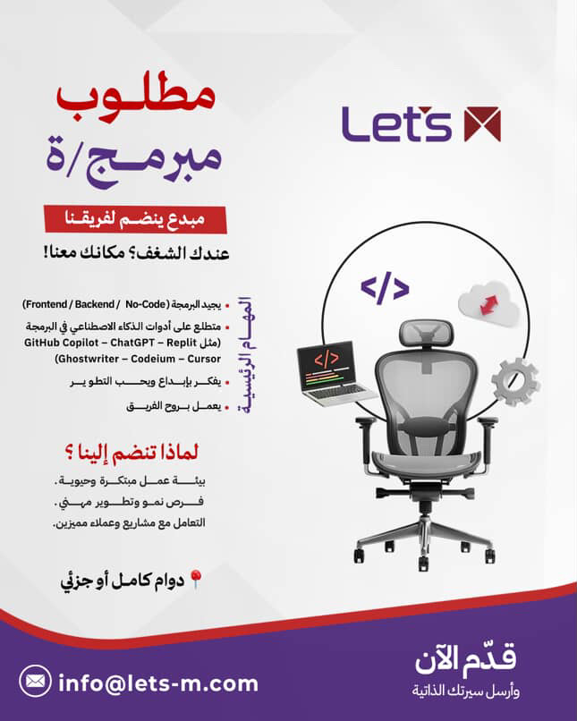 شركة لتس ام - 3 وظائف شاغرة ( مبرمج/ة + مبيعات + مصمم/ة جرافيك )