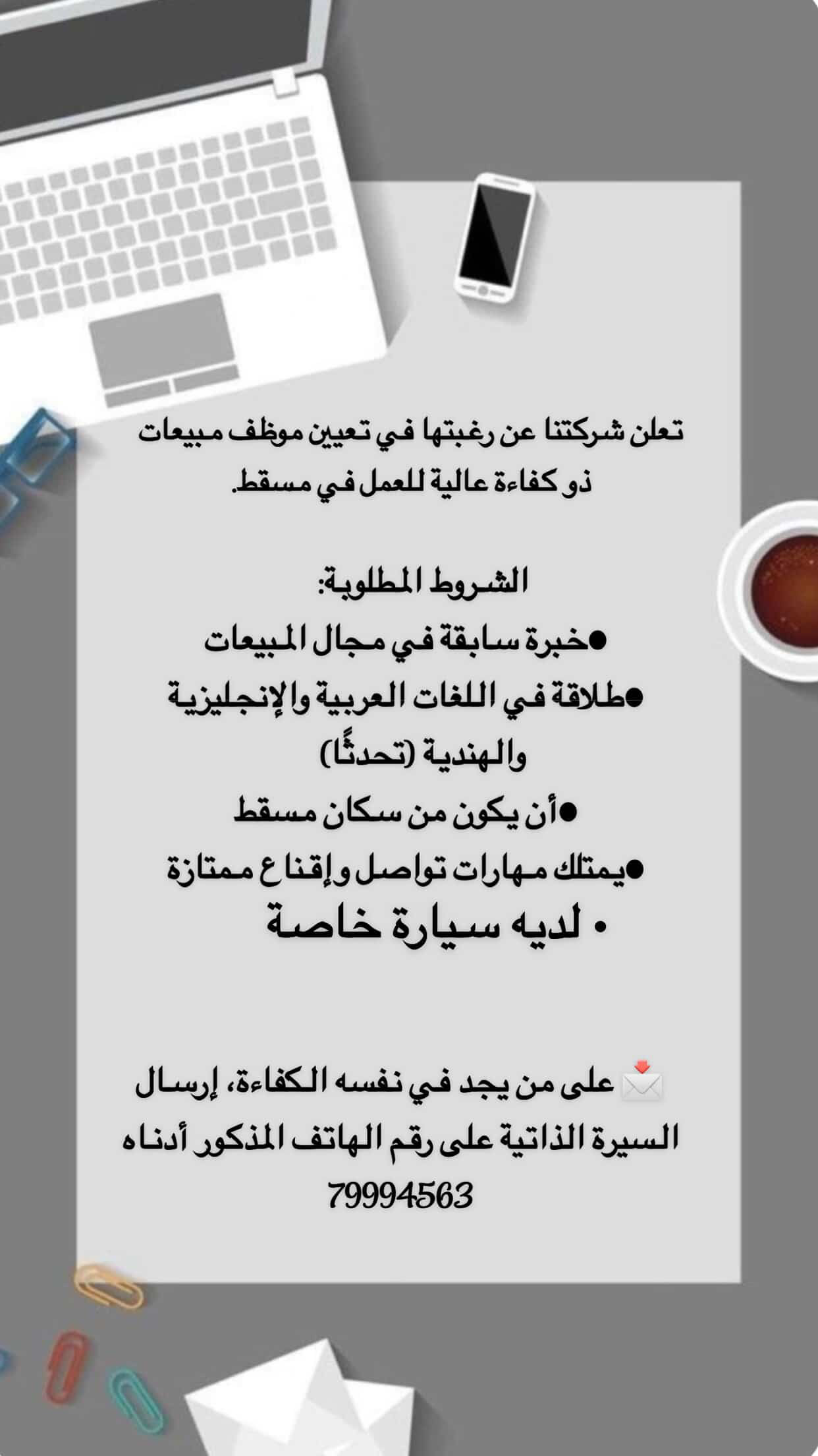 شركة رائدة في مسقط - وظيفة شاغرة ( موظف مبيعات )