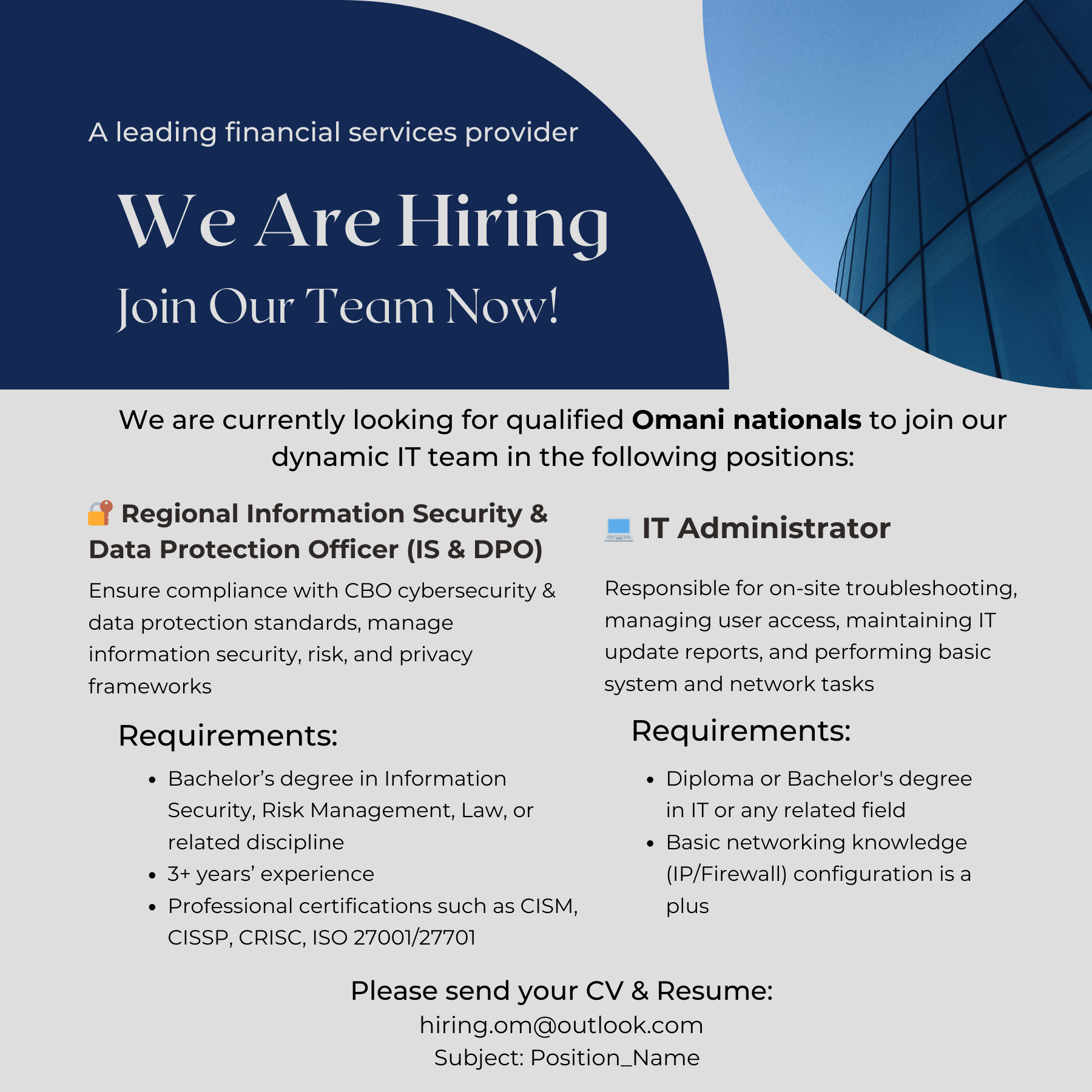 شركة خدمات مالية - وظيفتين شاغرتين ( Regional Information Security & Data Protection Officer (IS & DPO) + IT Administrator )
