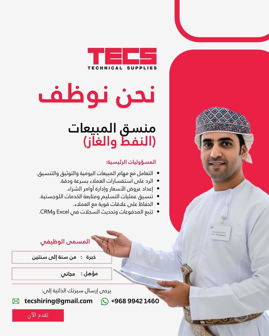 الشركة العالمية للتجهيزات الفنية - وظيفة شاغرة ( منسق المبيعات - النفط والغاز )