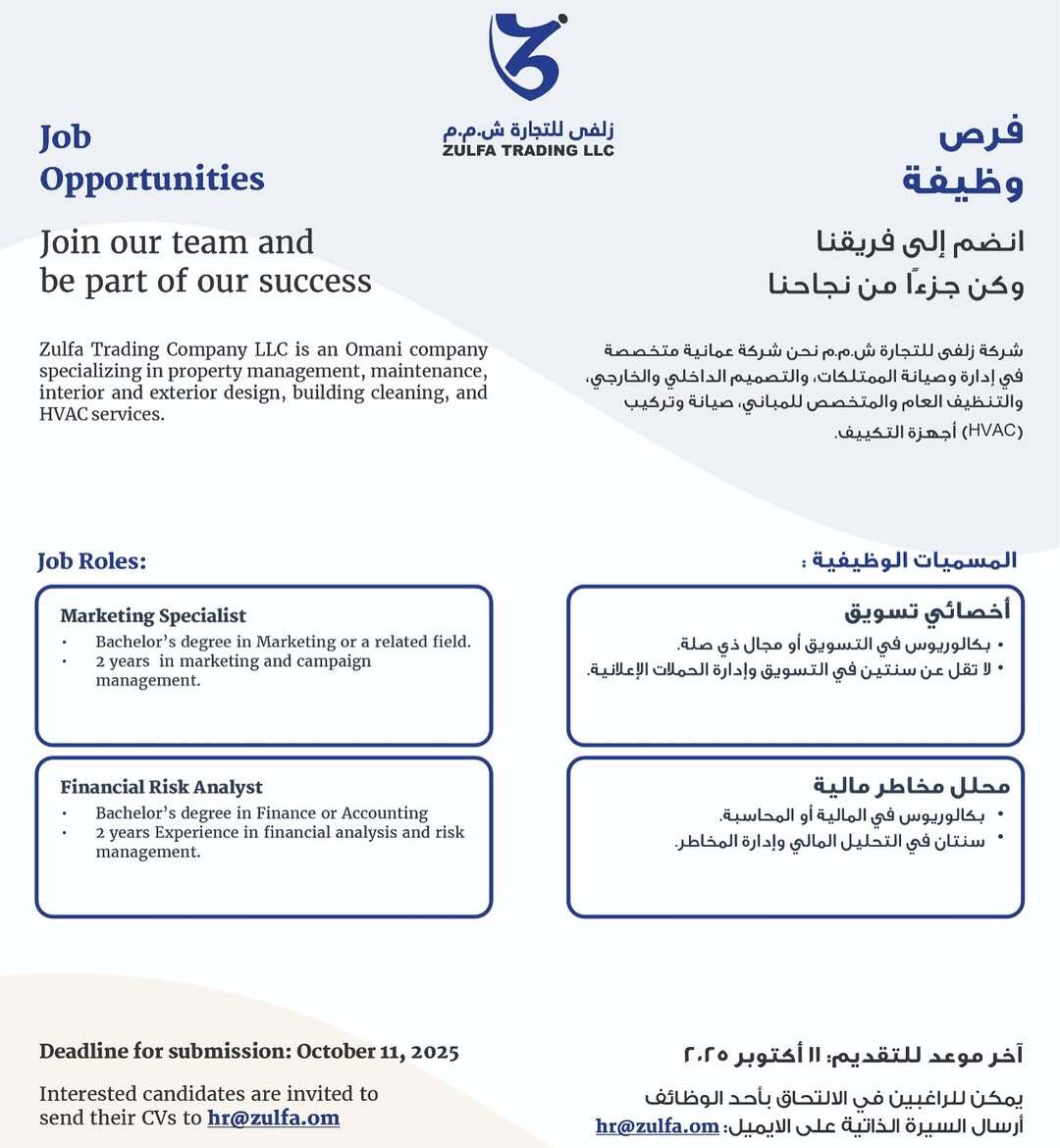 شركة زلفى للتجارة في صحار - وظائف شاغرة ( أخصائي تسويق + محلل مخاطر مالية )