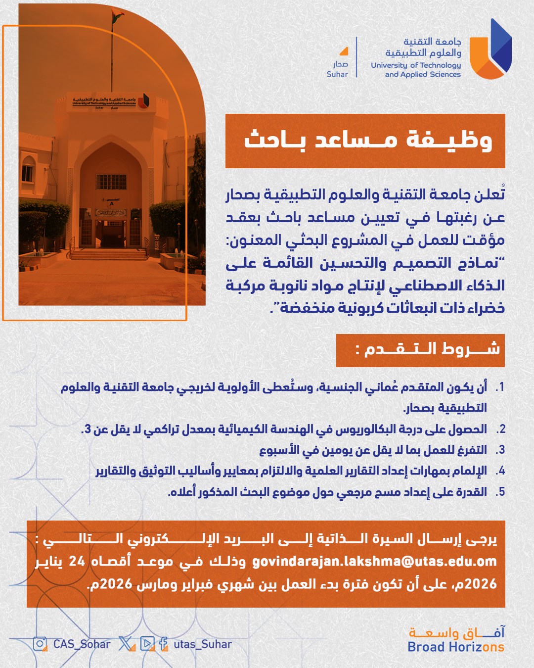 جامعة التقنية والعلوم التطبيقية بصحار - وظيفة شاغرة ( مساعد باحث بعقد مؤقت )