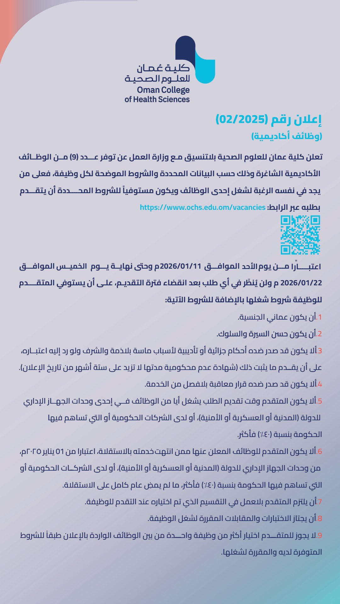 كلية عُمان للعلوم الصحية بالتنسيق مع وزارة العمل - توفر (9) وظائف أكاديمية شاغرة بنظام التعاقد