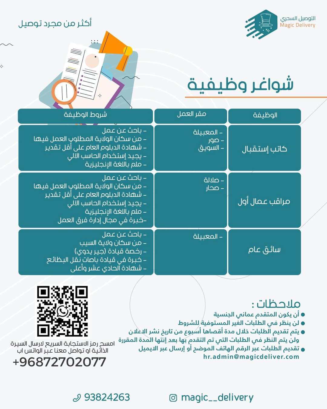 وزارة العمل ممثلة بالمديرية العامة للعمل في محافظة ظفار - توفر فرص عمل وظيفية في مؤسسات القطاع الخاص العاملة بالمحافظة لمختلف التخصصات والمؤهلات