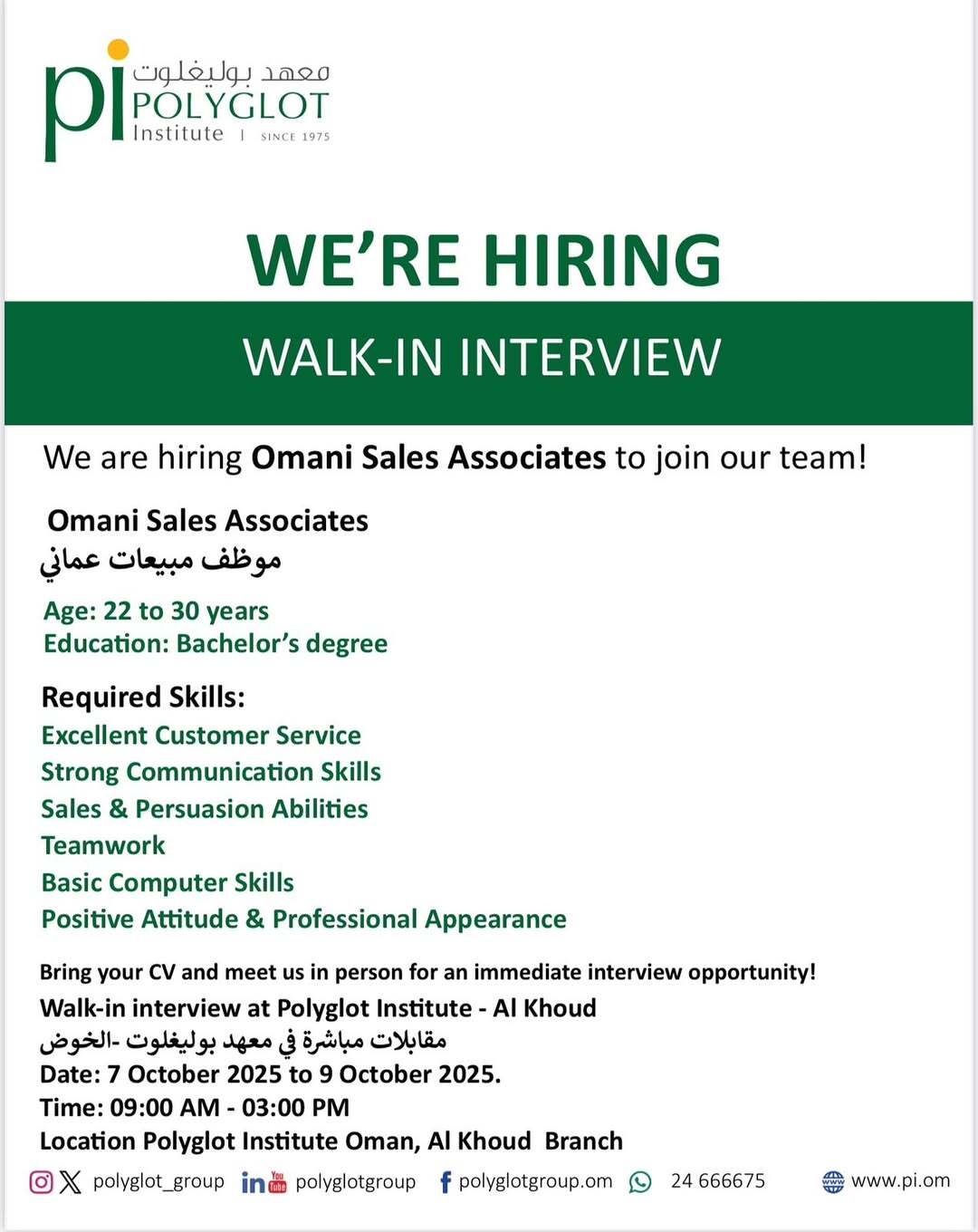 معهد بوليغلوت في الخوض - مقابلات مباشرة لوظيفة موظف مبيعات