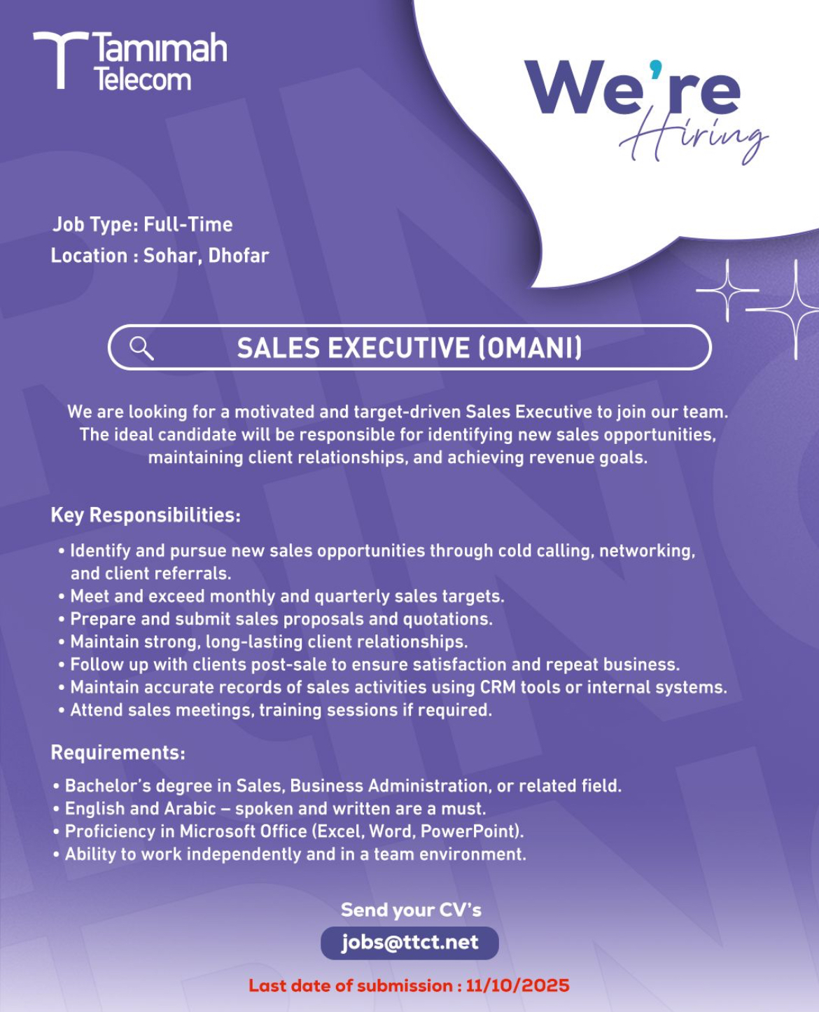 شركة تميمة للاتصالات - وظيفة شاغرة ( SALES EXECUTIVE )