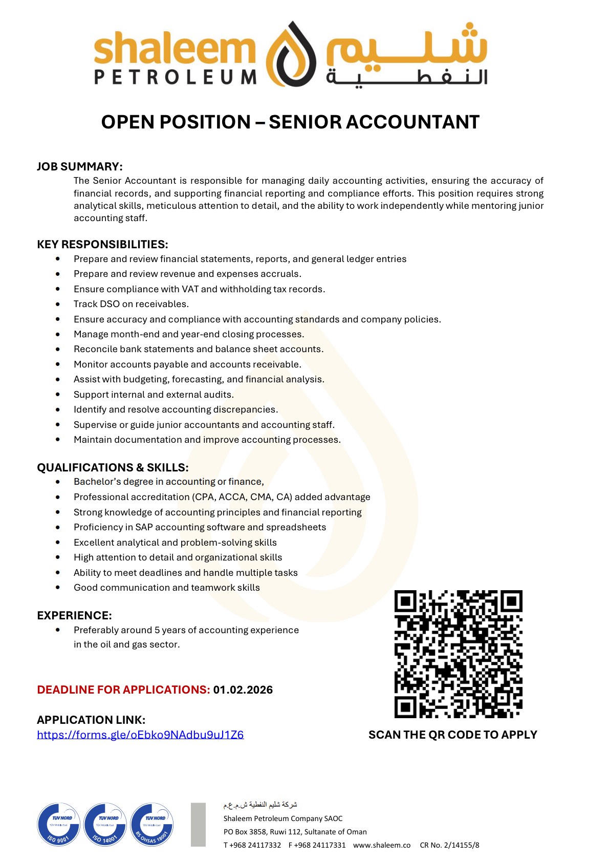 شركة شليم النفطية - وظيفة شاغرة ( Senior Accountant )